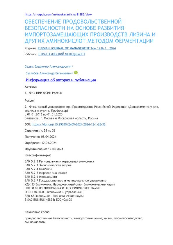 Седых, В.А. Обеспечение продовольственной безопасности на основе развития импортозамещающих производств лизина и других аминокислот методом ферментации / В.А. Седых, А.Е. Суглобов. — Текст: электронный // Russian Journal of Management. – 2024. – № 1. — С. 28-36. - URL: https://riorpub.com/ru/nauka/article/81285/view. - Дата публикации: 12.04.2024 — <URL:http://elib.fa.ru/art2024/bv3224.pdf>.