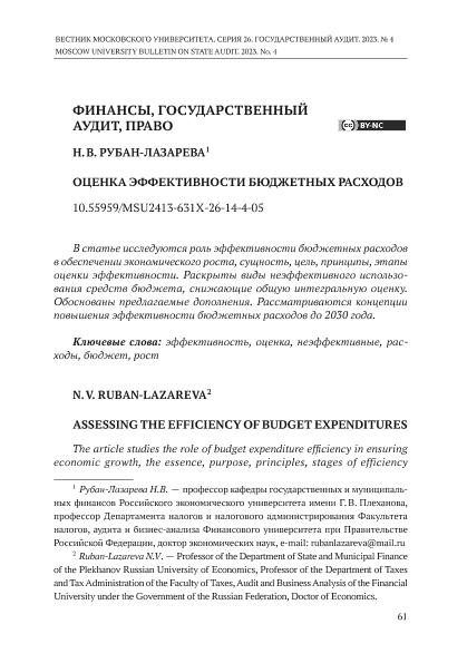 Рубан-Лазарева, Н.В. Оценка эффективности бюджетных расходов // Вестник Московского университета. Серия 26: Государственный аудит. – 2023. – № 4. — С. 61-73. — Только в электронном виде. — <URL:http://elib.fa.ru/art2023/bv4010.pdf>.