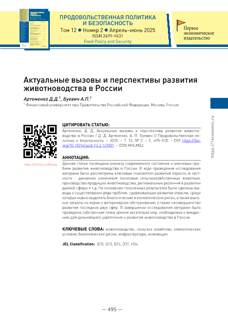 Артеменко, Д.Д. Актуальные вызовы и перспективы развития животноводства в России / Д.Д. Артеменко, А.П. Буевич // Продовольственная политика и безопасность. – 2025. – № 2. — С. 495-510. — Только в электронном виде. — <URL:http://elib.fa.ru/art2025/bv1897.pdf>.