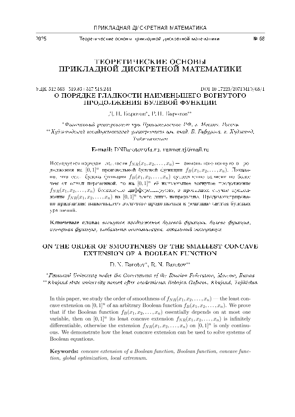 Баротов, Д.Н. О порядке гладкости наименьшего вогнутого продолжения булевой функции / Д.Н. Баротов, Р.Н. Баротов // Прикладная дискретная математика. – 2025. – № 68. — С. 5-15. — Только в электронном виде. — <URL:http://elib.fa.ru/art2025/bv1900.pdf>.