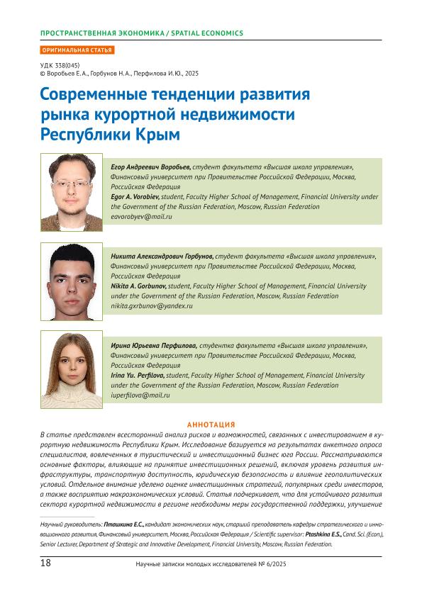 Воробьев, Е.А. Современные тенденции развития рынка курортной недвижимости Республики Крым / Е.А. Воробьев, Н.А. Горбунов, И.Ю. Перфилова // Научные записки молодых исследователей. – 2025. – № 6. — С. 18-31 — <URL:http://elib.fa.ru/art2025/bv1901.pdf>.