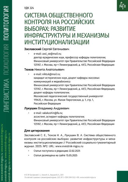 Заславский, С.Е. Система общественного контроля на российских выборах: развитие инфраструктуры и механизмы институционализации / С.Е. Заславский, Н.А. Тюков, В.А. Лукушин. — Текст: электронный // Российский социально-гуманитарный журнал
