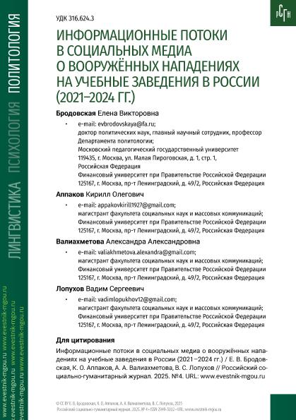 Информационные потоки в социальных медиа о вооружённых нападениях на учебные заведения в России (2021–2024 гг.) / Е.В. Бродовская, К.О. Аппаков, А.А. Валиахметова, В.С. Лопухов. — Текст: электронный // Российский социально-гуманитарный журнал