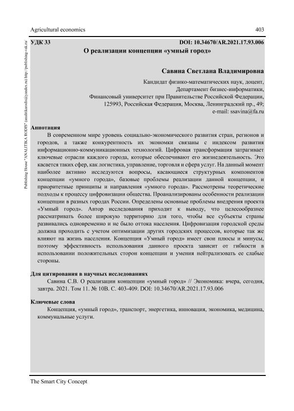 Савина С.В. О реализации концепции «умный город» // Экономика: вчера, сегодня, завтра. – 2021. – № 10В.-С.403-409. — Только в электронном виде. — <URL:http://elib.fa.ru/art2021/bv3552.pdf>.