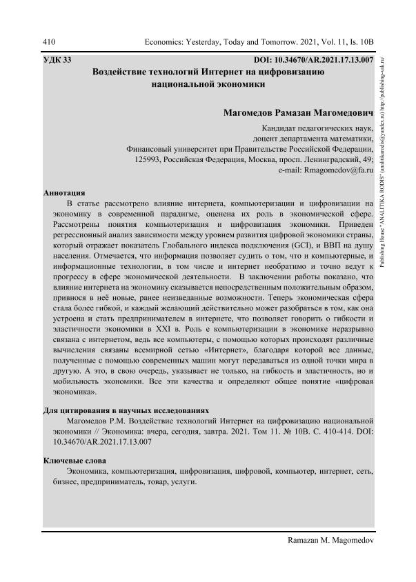 Магомедов Р.М. Воздействие технологий Интернет на цифровизацию национальной экономики // Экономика: вчера, сегодня, завтра. – 2021. – № 10В.-С.410-414. — Только в электронном виде. — <URL:http://elib.fa.ru/art2021/bv3553.pdf>.