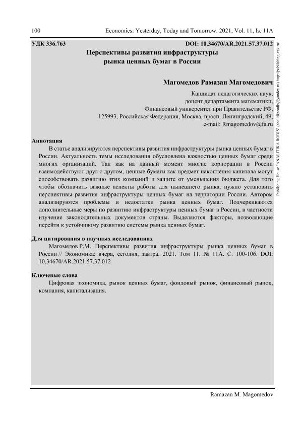 Магомедов Р.М. Перспективы развития инфраструктуры рынка ценных бумаг в России // Экономика: вчера, сегодня, завтра. – 2021. – № 11А.-С.100-106. — Только в электронном виде. — <URL:http://elib.fa.ru/art2021/bv3556.pdf>.