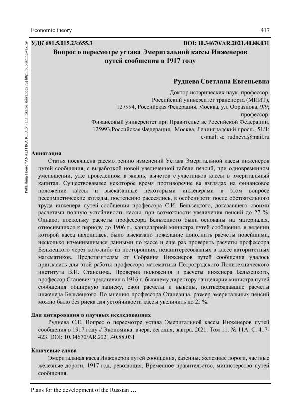 Руднева С.Е. Вопрос о пересмотре устава Эмеритальной кассы Инженеров путей сообщения в 1917 году // Экономика: вчера, сегодня, завтра. – 2021. – № 11А.-С.417-423. — Только в электронном виде. — <URL:http://elib.fa.ru/art2021/bv3557.pdf>.