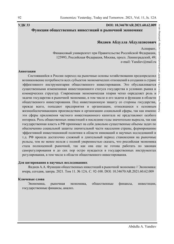 Яндиев А.А. Функции общественных инвестиций в рыночной экономике // Экономика: вчера, сегодня, завтра. – 2021. – № 12А.-С.92-100. — Только в электронном виде. — <URL:http://elib.fa.ru/art2021/bv3558.pdf>.