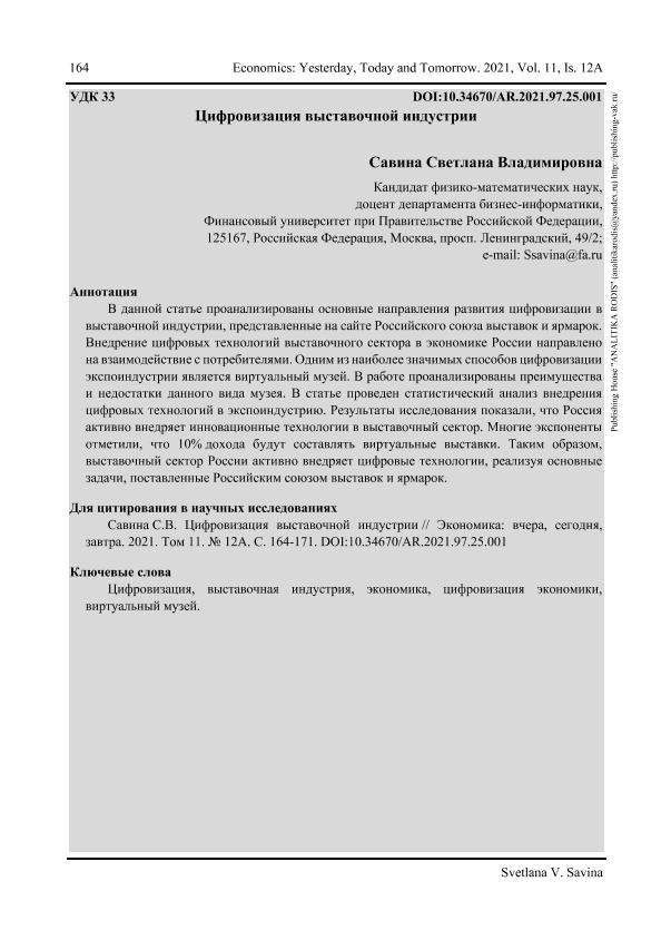 Савина С.В. Цифровизация выставочной индустрии // Экономика: вчера, сегодня, завтра. – 2021. – № 12А.-С.164-171. — Только в электронном виде. — <URL:http://elib.fa.ru/art2021/bv3559.pdf>.