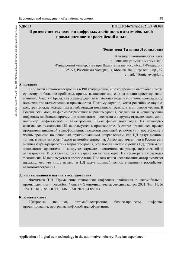Фомичева Т.Л. Применение технологии цифровых двойников в автомобильной промышленности: российский опыт // Экономика: вчера, сегодня, завтра. – 2021. – № 12А.-С.181-186. — Только в электронном виде. — <URL:http://elib.fa.ru/art2021/bv3560.pdf>.