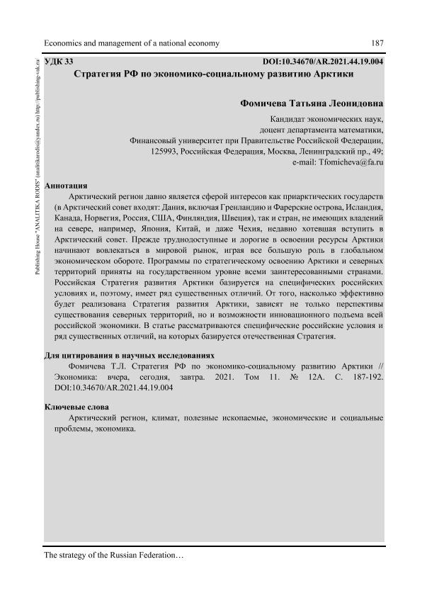 Фомичева Т.Л. Стратегия РФ по экономико-социальному развитию Арктики // Экономика: вчера, сегодня, завтра. – 2021. – № 12А.-С.187-192. — Только в электронном виде. — <URL:http://elib.fa.ru/art2021/bv3561.pdf>.
