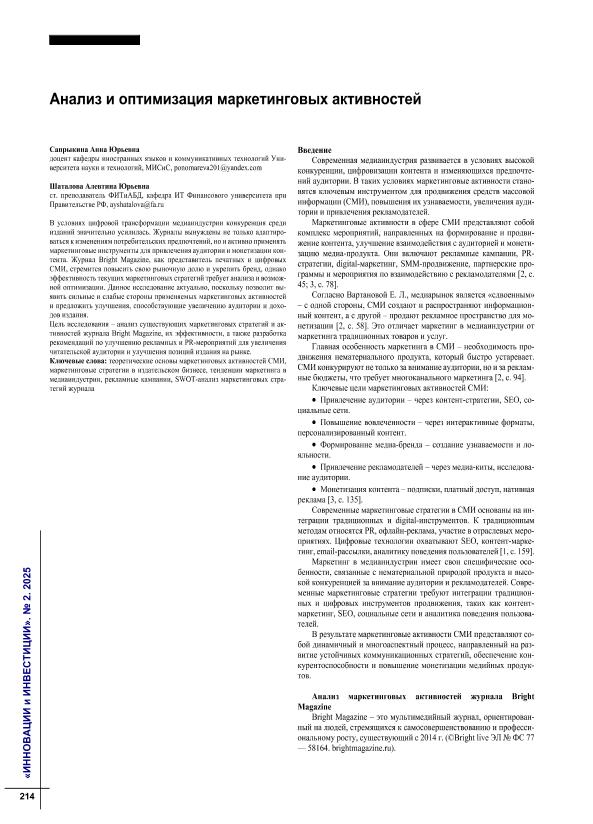 Сапрыкина, А.Ю. Анализ и оптимизация маркетинговых активностей / А.Ю. Сапрыкина, А.Ю. Шаталова // Инновации и инвестиции. – 2025. – № 2. — С. 214-219. — Только в электронном виде. — <URL:http://elib.fa.ru/art2025/bv1566.pdf>.