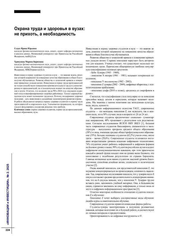 Седых, И.Ю. Охрана труда и здоровья в вузах: не прихоть, а необходимость / И.Ю. Седых, М.Б. Хрипунова // Инновации и инвестиции. – 2025. – № 2. — С. 224-226. — Только в электронном виде. — <URL:http://elib.fa.ru/art2025/bv1570.pdf>.