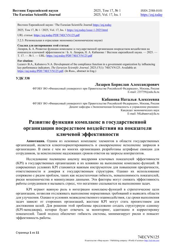 Лазарев, Б.А. Развитие функции комплаенс в государственной организации посредством воздействия на показатели ключевой эффективности / Б.А. Лазарев, Н.А. Кабанова. — Текст: электронный // Вестник Евразийской науки. – 2025. – № 1. — URL: https://esj.today/PDF/74ECVN125.pdf (дата обращения: 14.10.2025) — <URL:http://elib.fa.ru/art2025/bv795.pdf>.