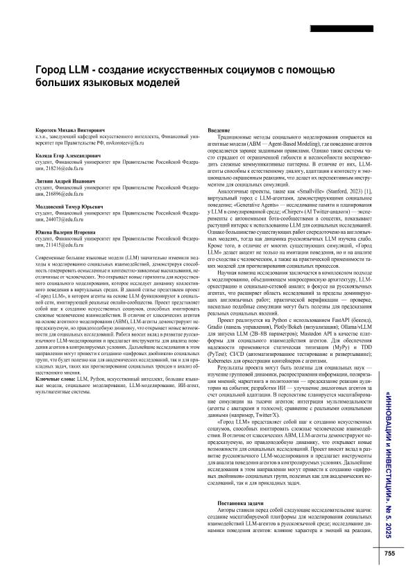 Город LLM - cоздание искусственных социумов с помощью больших языковых моделей / М.В. Коротеев, Е.А. Коляда, А.И. Литвин [и др.] // Инновации и инвестиции. – 2025. – № 5. — С. 755-759. — Только в электронном виде. — <URL:http://elib.fa.ru/art2025/bv1724.pdf>.