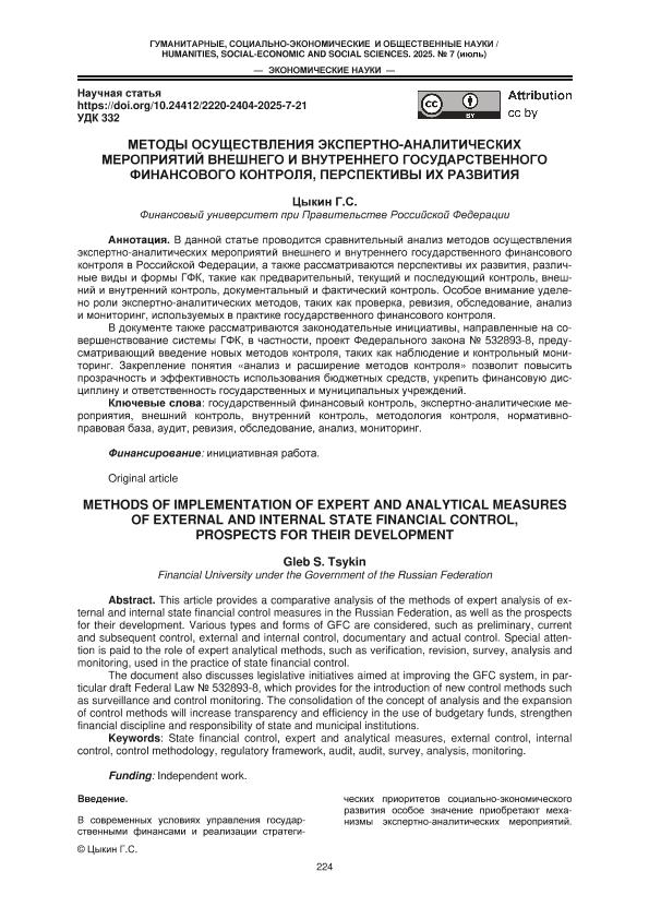 Цыкин, Г.С. Методы осуществления экспертно-аналитических мероприятий внешнего и внутреннего государственного финансового контроля, перспективы их развития // Гуманитарные, социально-экономические и общественные науки. – 2025. – № 7. — С. 224-232. — Только в электронном виде. — <URL:http://elib.fa.ru/art2025/bv1953.pdf>.