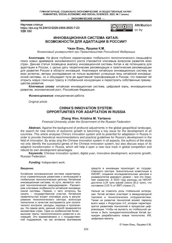 Чжан Вэнь. Инновационная система Китая: возможности для адаптации в России? / Чжан Вэнь, К.М. Ярцева // Гуманитарные, социально-экономические и общественные науки. – 2025. – № 7. — С. 239-246. — Только в электронном виде. — <URL:http://elib.fa.ru/art2025/bv1954.pdf>.