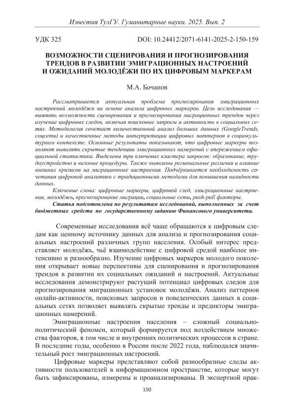 Бочанов, М.А. Возможности сценирования и прогнозирования трендов в развитии эмиграционных настроений и ожиданий молодежи по их цифровым маркерам // Известия Тульского государственного университета. Гуманитарные науки. – 2025. – № 2. — С. 150-159. — Только в электронном виде. — <URL:http://elib.fa.ru/art2025/bv1961.pdf>.