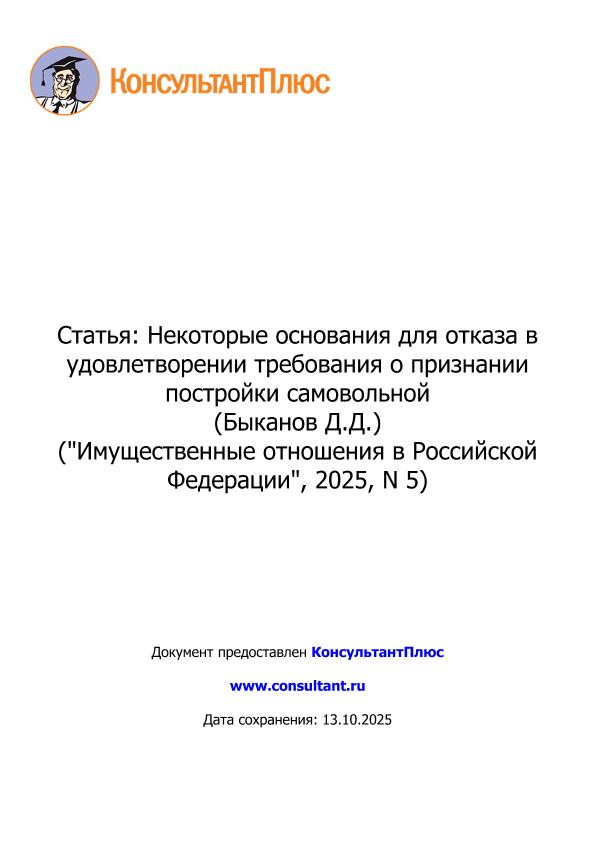 Быканов, Д.Д. Некоторые основания для отказа в удовлетворении требования о признании постройки самовольной // Имущественные отношения в Российской Федерации. – 2025. – № 5. — С. 79-90. — Только в электронном виде. — <URL:http://elib.fa.ru/art2025/bv1962.pdf>.