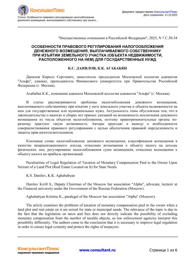 денежного возмещения, выплачиваемого собственнику при изъятии земельного участка (объекта недвижимости, расположенного на нем) для государственных нужд / К.С. Данилов, К.К. Агабабян // Имущественные отношения в Российской Федерации. – 2025. – № 7. — С. 30-34. — Только в электронном виде. — <URL:http://elib.fa.ru/art2025/bv1963.pdf>.