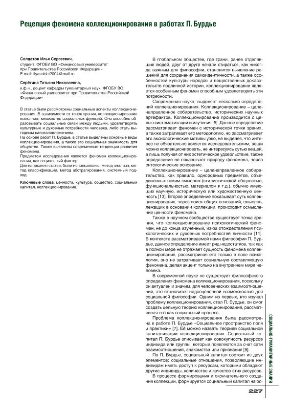Солдатов, И.С. Рецепция феномена коллекционирования в работах П. Бурдье / И.С. Солдатов, Т.Н. Серегина // Социально-гуманитарные знания. – 2025. – № 4. — С. 227-230. — Только в электронном виде. — <URL:http://elib.fa.ru/art2025/bv2106.pdf>.