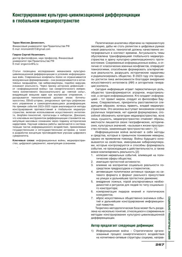 дифференциации в глобальном медиапространстве / М.Д. Таран, С.Н. Гавров // Социально-гуманитарные знания. – 2025. – № 4. — С. 267-269. — Только в электронном виде. — <URL:http://elib.fa.ru/art2025/bv2107.pdf>.