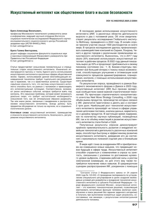 Брега, А.В. Искусственный интеллект как общественное благо и вызов безопасности / А.В. Брега, Г.В. Брега // Социально-гуманитарные знания. – 2025. – № 2. — С. 97-102. — Только в электронном виде. — <URL:http://elib.fa.ru/art2025/bv2536.pdf>.