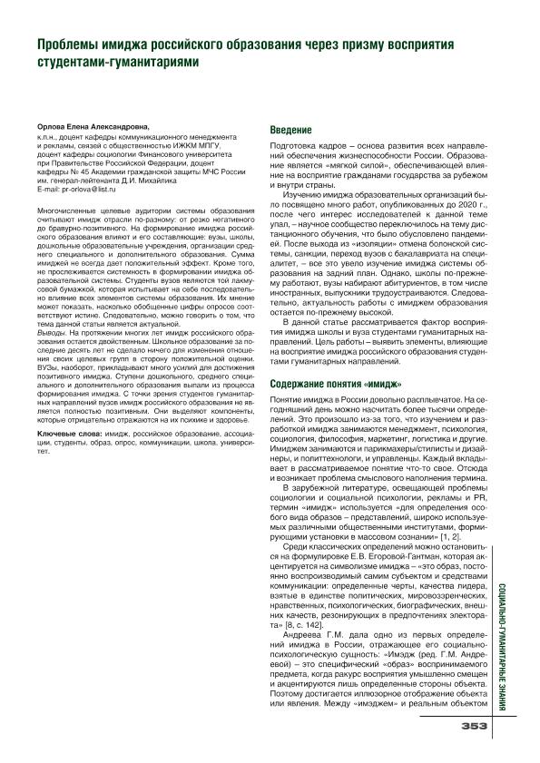 Орлова, Е.А. Проблемы имиджа российского образования через призму восприятия студентами-гуманитариями // Социально-гуманитарные знания. – 2025. – № 2. — С. 353-359. — Только в электронном виде. — <URL:http://elib.fa.ru/art2025/bv2570.pdf>.