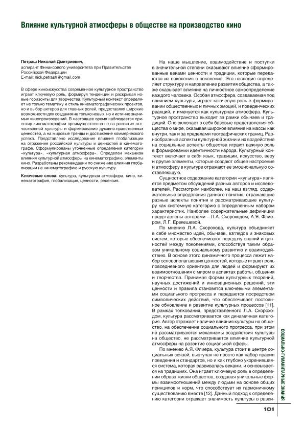 Петраш, Н.Д. Влияние культурной атмосферы в обществе на производство кино // Социально-гуманитарные знания. – 2025. – № 1. — С. 101-106. — Только в электронном виде. — <URL:http://elib.fa.ru/art2025/bv2571.pdf>.