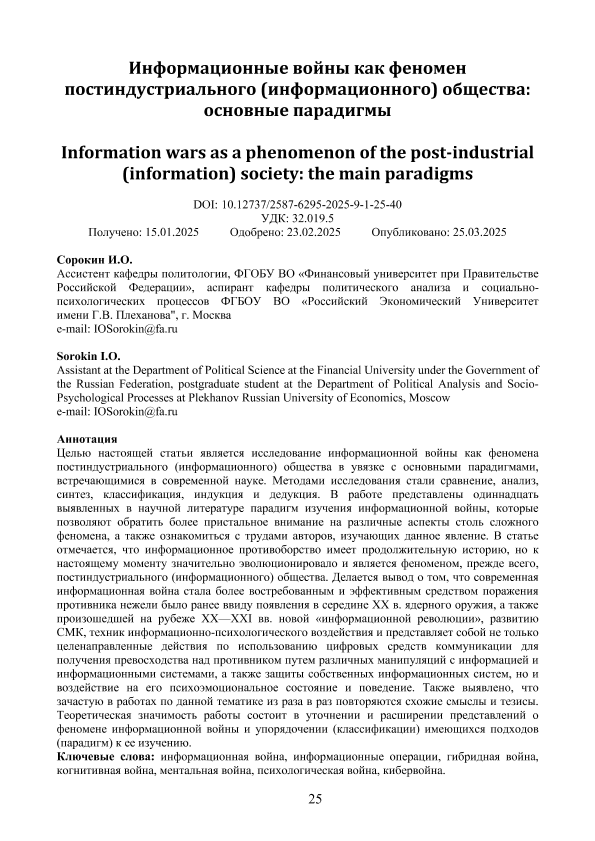 Сорокин, И.О. Информационные войны как феномен постиндустриального (информационного) общества: основные парадигмы. — Текст: электронный // Журнал политических исследований. – 2025. – № 1. — С. 25-40. - URL: https://naukaru.ru/ru/storage/viewWindow/197073. - Дата публикации: 25.03.2025 — <URL:http://elib.fa.ru/art2025/bv748.pdf>.