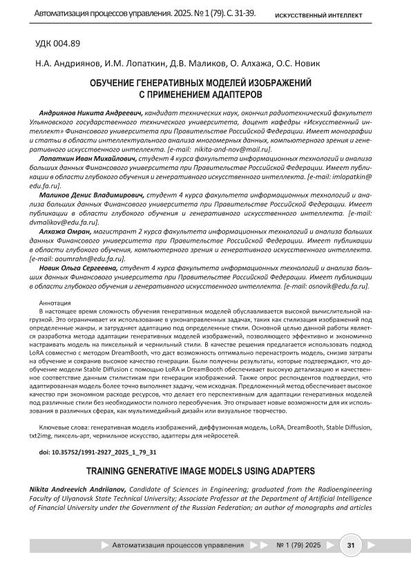 Обучение генеративных моделей изображений с применением адаптеров / Н.А. Андриянов, И.М. Лопаткин, Д.В. Маликов [и др.] // Автоматизация процессов управления. – 2025. – № 1. — С. 31-39. — Только в электронном виде. — <URL:http://elib.fa.ru/art2025/bv749.pdf>.