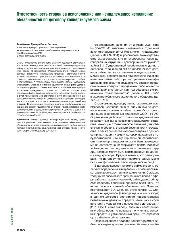 Телибекова, Д.Б. Ответственность сторон за неисполнение или ненадлежащее исполнение обязанностей по договору конвертируемого займа // Юридическая наука. – 2025. – № 5. — С. 290-294. — Только в электронном виде. — <URL:http://elib.fa.ru/art2025/bv750.pdf>.