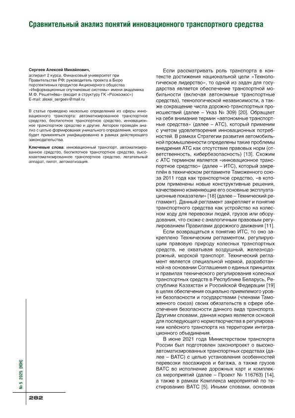 Сергеев, А.М. Сравнительный анализ понятий инновационного транспортного средства // Юридическая наука. – 2025. – № 5. — С. 282-286. — Только в электронном виде. — <URL:http://elib.fa.ru/art2025/bv751.pdf>.