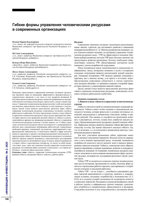 Гибкие формы управления человеческими ресурсами в современных организациях / М.В. Полевая, А.А. Чуб, И.Н. Белогруд [и др.] // Инновации и инвестиции. – 2025. – № 2. — С. 106-109. — Только в электронном виде. — <URL:http://elib.fa.ru/art2025/bv1533.pdf>.