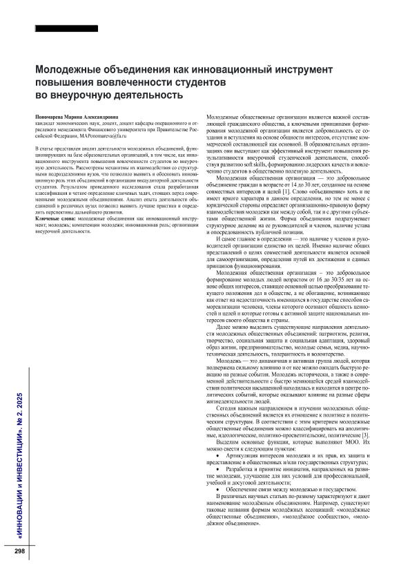 во внеурочную деятельность // Инновации и инвестиции. – 2025. – № 2. — С. 298-301. — Только в электронном виде. — <URL:http://elib.fa.ru/art2025/bv1537.pdf>.