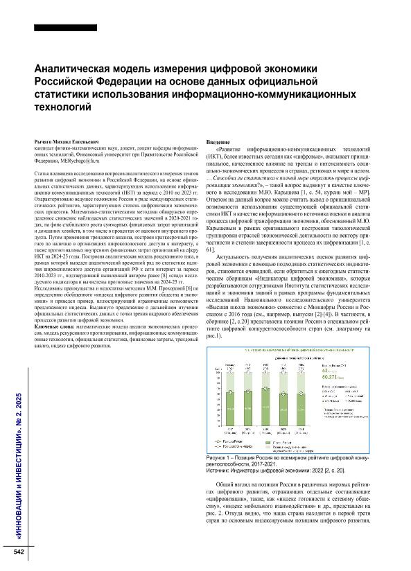 Рычаго, М.Е. Аналитическая модель измерения цифровой экономики Российской Федерации на основе данных официальной статистики использования информационно-коммуникационных технологий // Инновации и инвестиции. – 2025. – № 2. — С. 542-546. — Только в электронном виде. — <URL:http://elib.fa.ru/art2025/bv1550.pdf>.