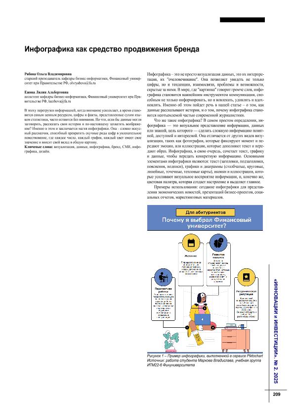 Рябова, О.В. Инфографика как средство продвижения бренда / О.В. Рябова, Л.А. Ежова // Инновации и инвестиции. – 2025. – № 2. — С. 209-213. — Только в электронном виде. — <URL:http://elib.fa.ru/art2025/bv1554.pdf>.
