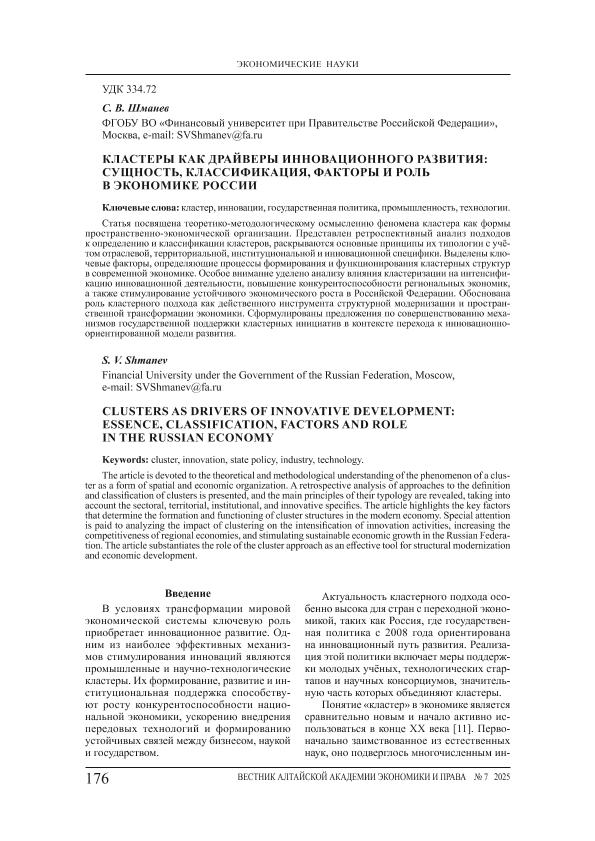 Шманев, С.В. Кластеры как драйверы инновационного развития: сущность, классификация, факторы и роль в экономике России // Вестник Алтайской академии экономики и права. – 2025. – № 7-1. — С. 176-184. — Только в электронном виде. — <URL:http://elib.fa.ru/art2025/bv1629.pdf>.