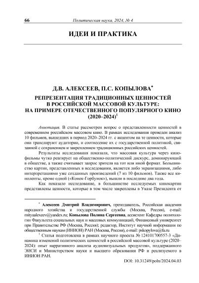 Алексеев, Д.В. Репрезентация традиционных ценностей в российской массовой культуре: на примере отечественного популярного кино (2020–2024) / Д.В. Алексеев, П.С. Копылова // Политическая наука. – 2024. – № 4. — С. 67-97. — Только в электронном виде. — <URL:http://elib.fa.ru/art2024/bv3861.pdf>.