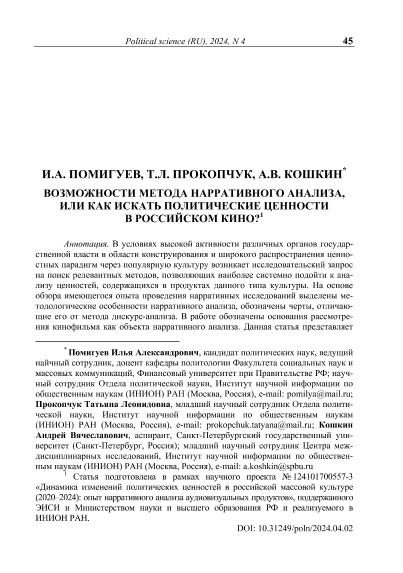 Помигуев, И.А. Возможности метода нарративного анализа, или как искать политические ценности в российском кино? / И.А. Помигуев, Т.Л. Прокопчук, А.В. Кошкин // Политическая наука. – 2024. – № 4. — С. 45-65. — Только в электронном виде. — <URL:http://elib.fa.ru/art2024/bv3875.pdf>.