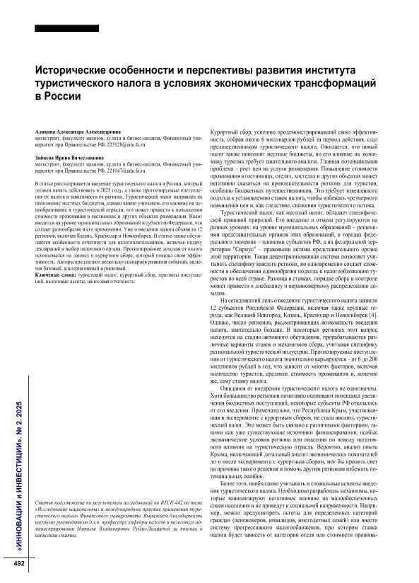Аликова, А.А. Исторические особенности и перспективы развития института туристического налога в условиях экономических трансформаций