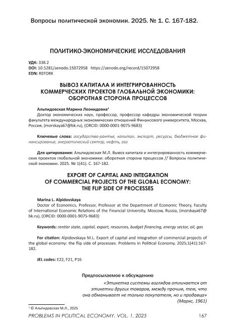 Альпидовская, М.Л. Вывоз капитала и интегрированность коммерческих проектов глобальной экономики: оборотная сторона процессов // Вопросы политической экономии. – 2025. – № 1. — С. 167-182. — Только в электронном виде. — <URL:http://elib.fa.ru/art2025/bv803.pdf>.