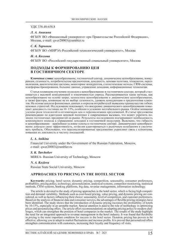 Аникина, Л.А. Подходы к формированию цен в гостиничном секторе / Л.А. Аникина, С.К. Тарчоков, Н.А. Козлова // Вестник Алтайской академии экономики и права. – 2025. – № 7-1. — С. 15-21. — Только в электронном виде. — <URL:http://elib.fa.ru/art2025/bv804.pdf>.