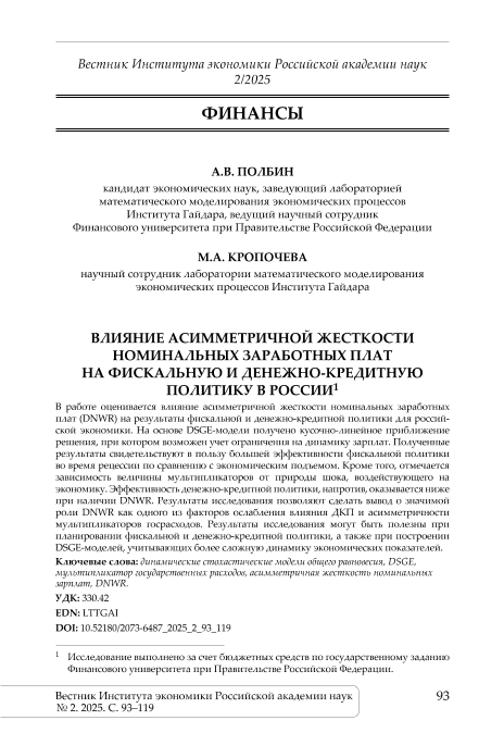 Полбин, А.В. Влияние асимметричной жесткости номинальных заработных плат на фискальную и денежно-кредитную политику России / А.В. Полбин, М.А. Кропочева // Вестник Института экономики Российской академии наук. – 2025. – № 2. — С. 93-119. — Только в электронном виде. — <URL:http://elib.fa.ru/art2025/bv1532.pdf>.
