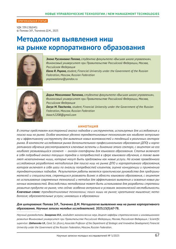 Попова, Э.Р. Методология выявления ниш на рынке корпоративного образования / Э.Р. Попова, Д.М. Ткаченко // Научные записки молодых исследователей. – 2025. – № 5. — С. 67-78 — <URL:http://elib.fa.ru/art2025/bv1540.pdf>.