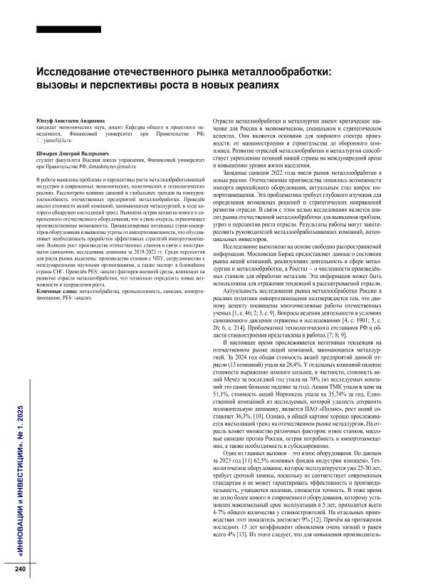 Юссуф, А.А. Исследование отечественного рынка металлообработки: вызовы и перспективы роста в новых реалиях / А.А. Юссуф, Д.В. Шмырев // Инновации и инвестиции. – 2025. – № 1. — С. 240-243. — Только в электронном виде. — <URL:http://elib.fa.ru/art2025/bv1642.pdf>.