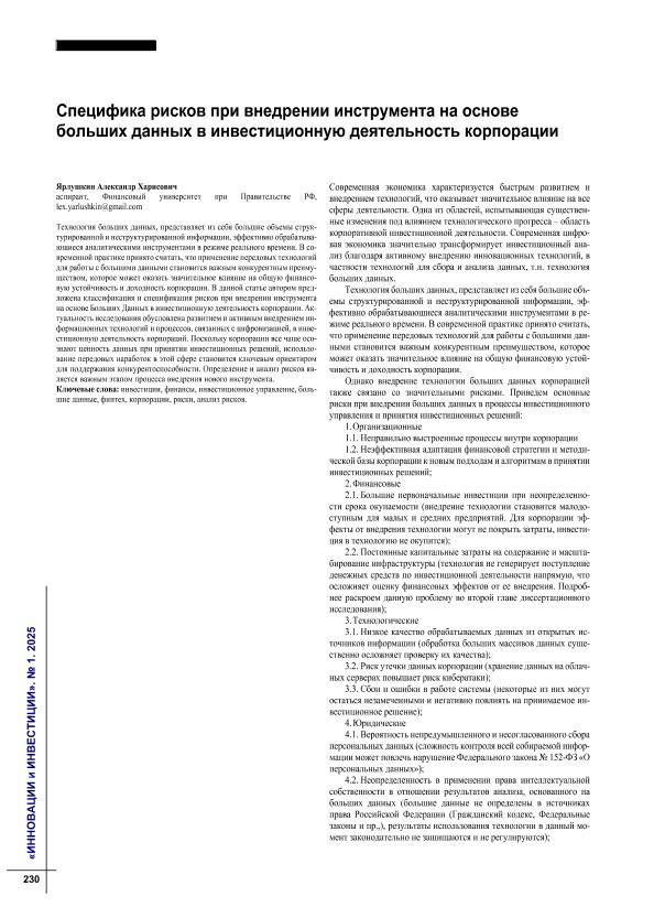 Ярлушкин, А.Х. Специфика рисков при внедрении инструмента на основе больших данных в инвестиционную деятельность // Инновации и инвестиции. – 2025. – № 1. — С. 230-233. — Только в электронном виде. — <URL:http://elib.fa.ru/art2025/bv1646.pdf>.