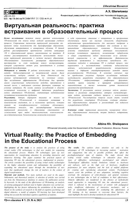 Шелепаева, А.Х. Виртуальная реальность: практика встраивания в образовательный процесс // Открытое образование. – 2025. – № 4. — С. 19-28. — Только в электронном виде. — <URL:http://elib.fa.ru/art2025/bv1623.pdf>.
