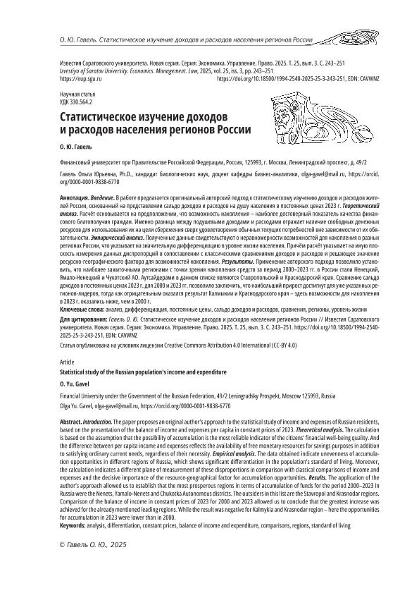 Гавель, О.Ю. Статистическое изучение доходов и расходов населения регионов России // Известия Саратовского университета. Новая серия. Серия: Экономика. Управление. Право. – 2025. – № 3. — С. 243-251. — Только в электронном виде. — <URL:http://elib.fa.ru/art2025/bv825.pdf>.