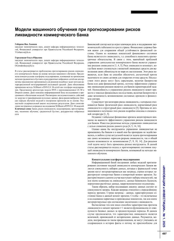 Гобарева, Я.Л. Модели машинного обучения при прогнозировании рисков ликвидности коммерческого банка / Я.Л. Гобарева, О.Ю. Городецкая // Инновации и инвестиции. – 2025. – № 1. — С. 497-501. — Только в электронном виде. — <URL:http://elib.fa.ru/art2025/bv826.pdf>.